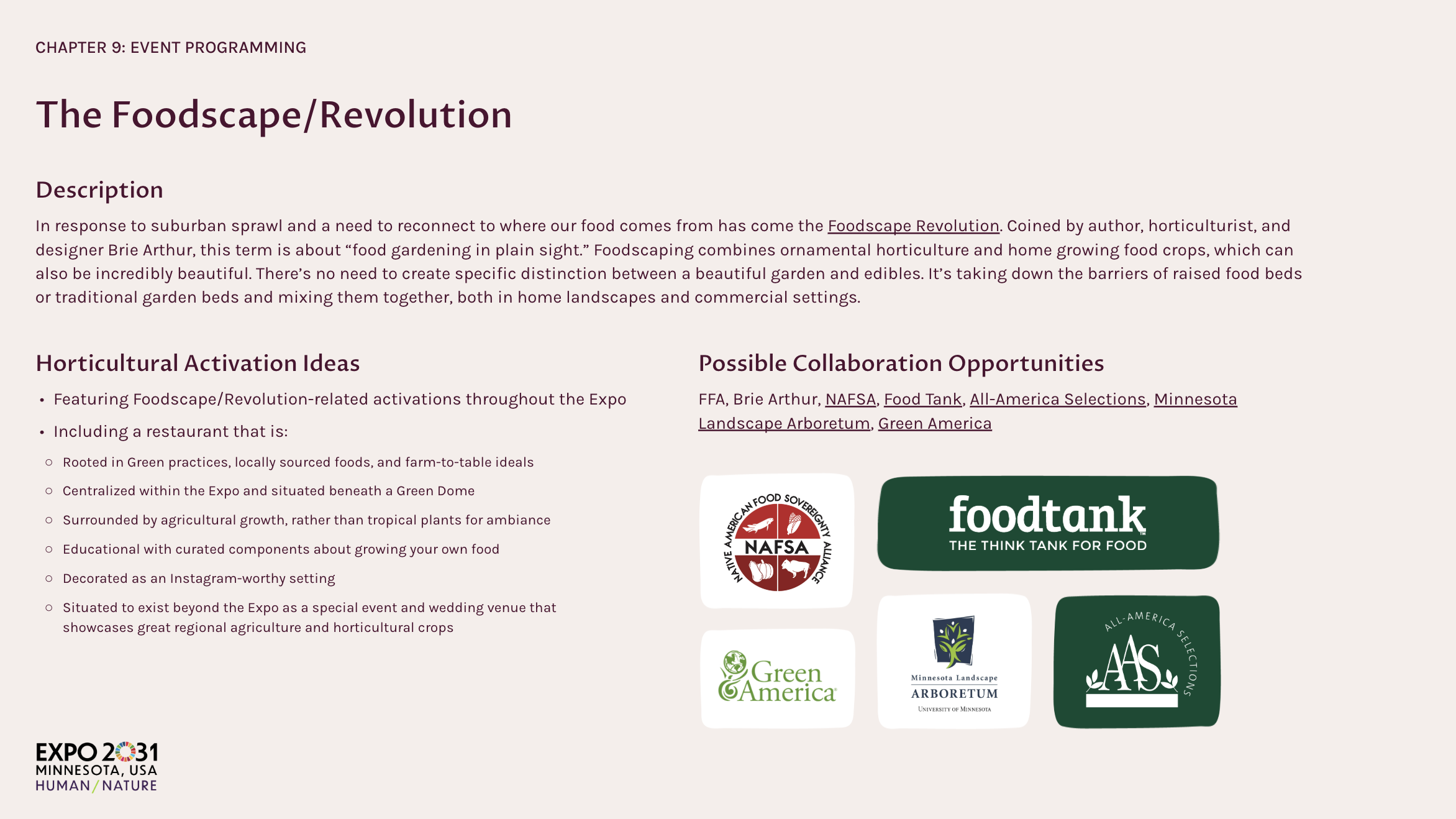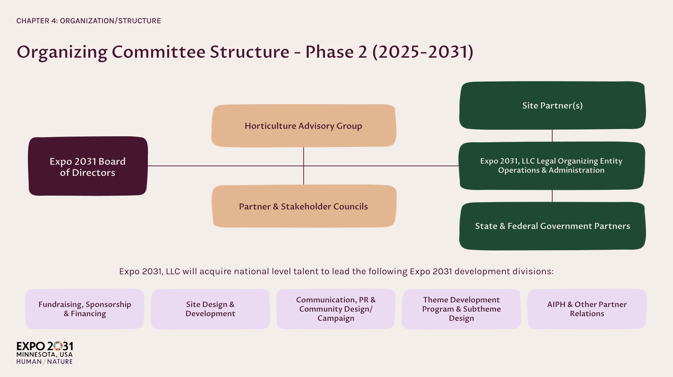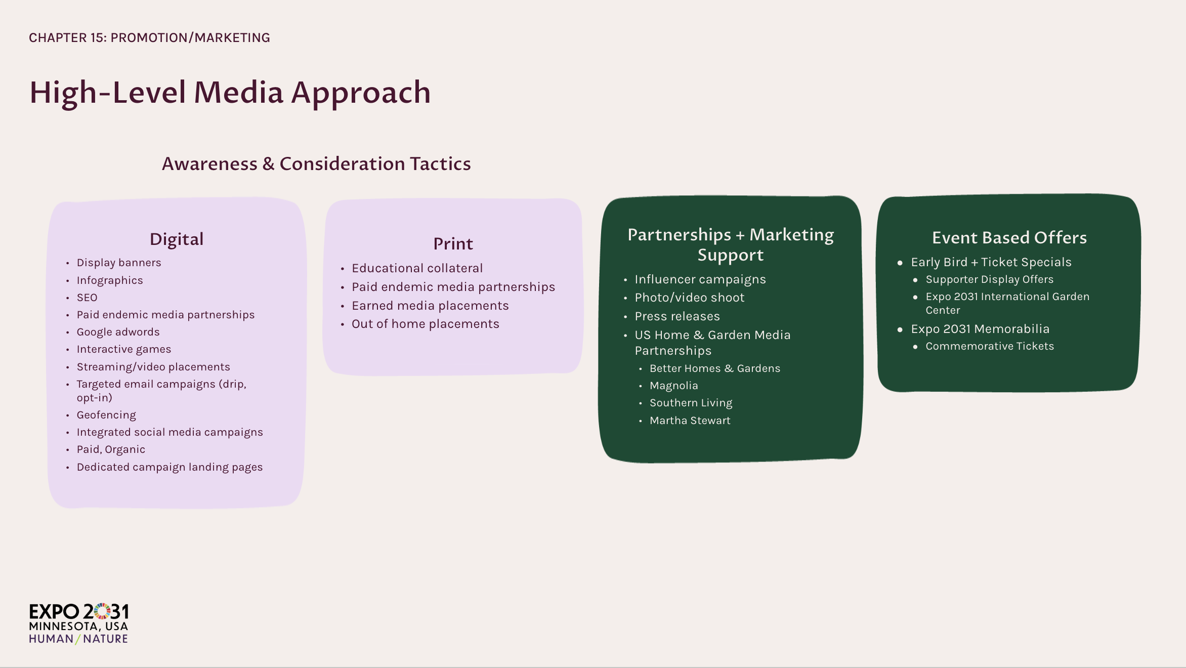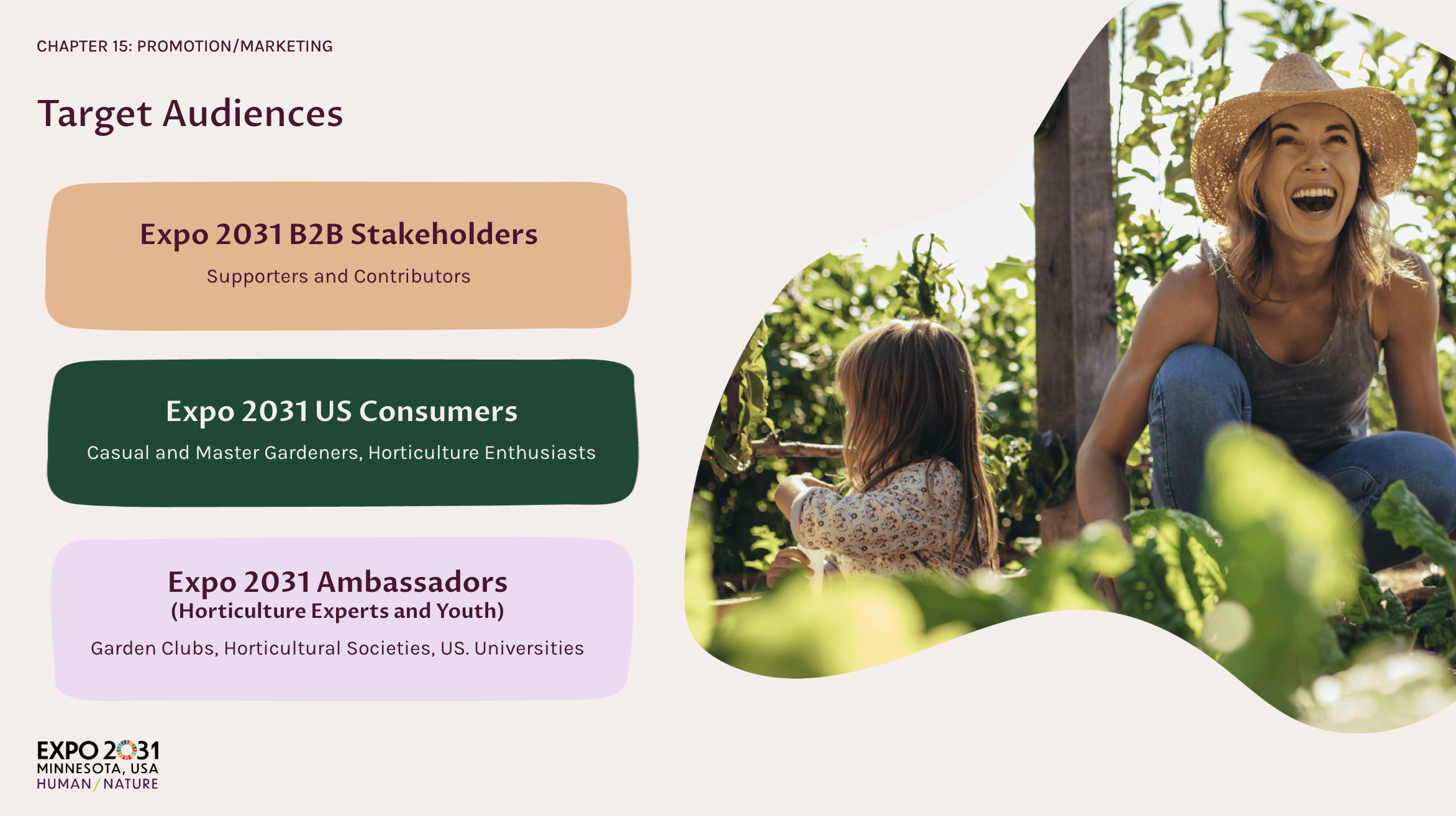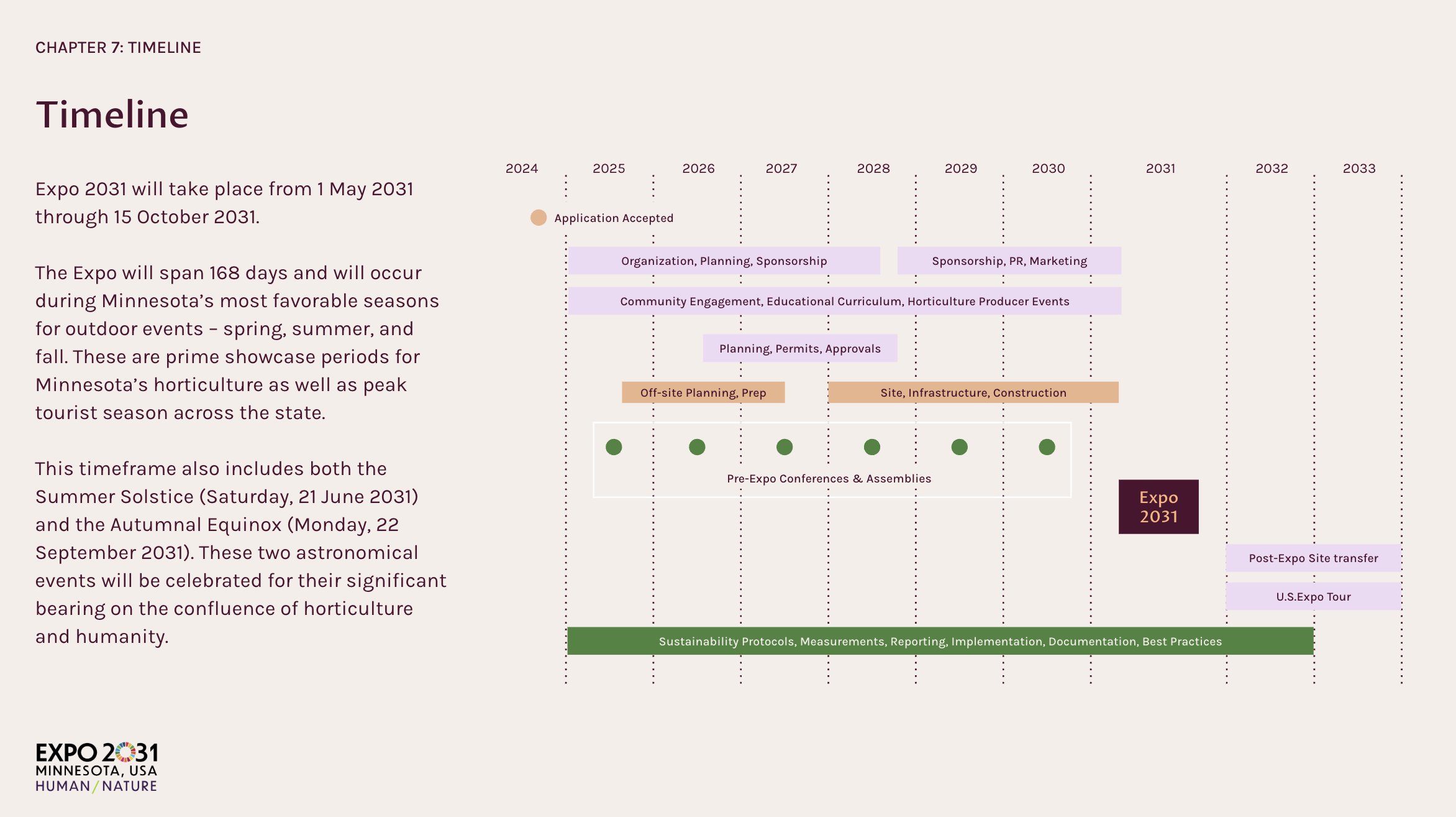 Minnesota was competing to host the World Horticultural Exposition 2031. Existing materials were dense and inconsistent; we needed a single deck that felt inspiring and credible across 19+ chapters (theme, master plan, programming, visitors, transport, finance, legacy).