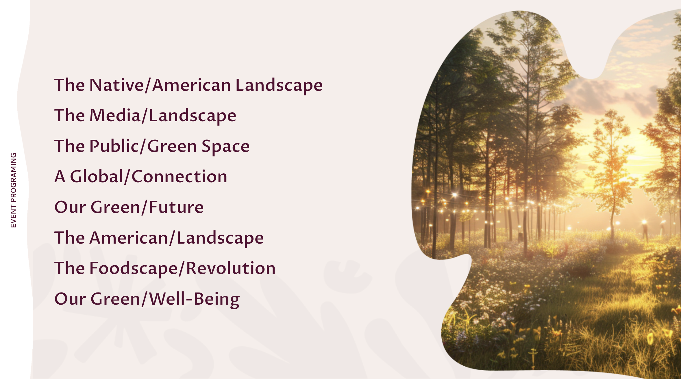 The Program Map tiles reveal breadth at a glance—Native/American Landscape, Media/Landscape, Public/Green Space, Our Green/Future, American/Landscape, and Foodscape/Revolution—each with a one-line why, activation ideas, and partners.