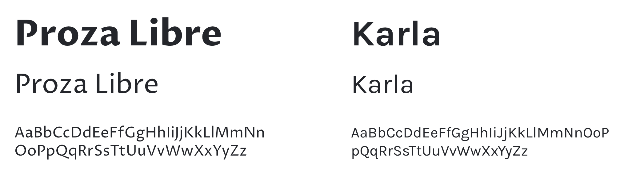 Typography pairs Proza Libre for expressive headlines with Karla for clean, readable body copy.